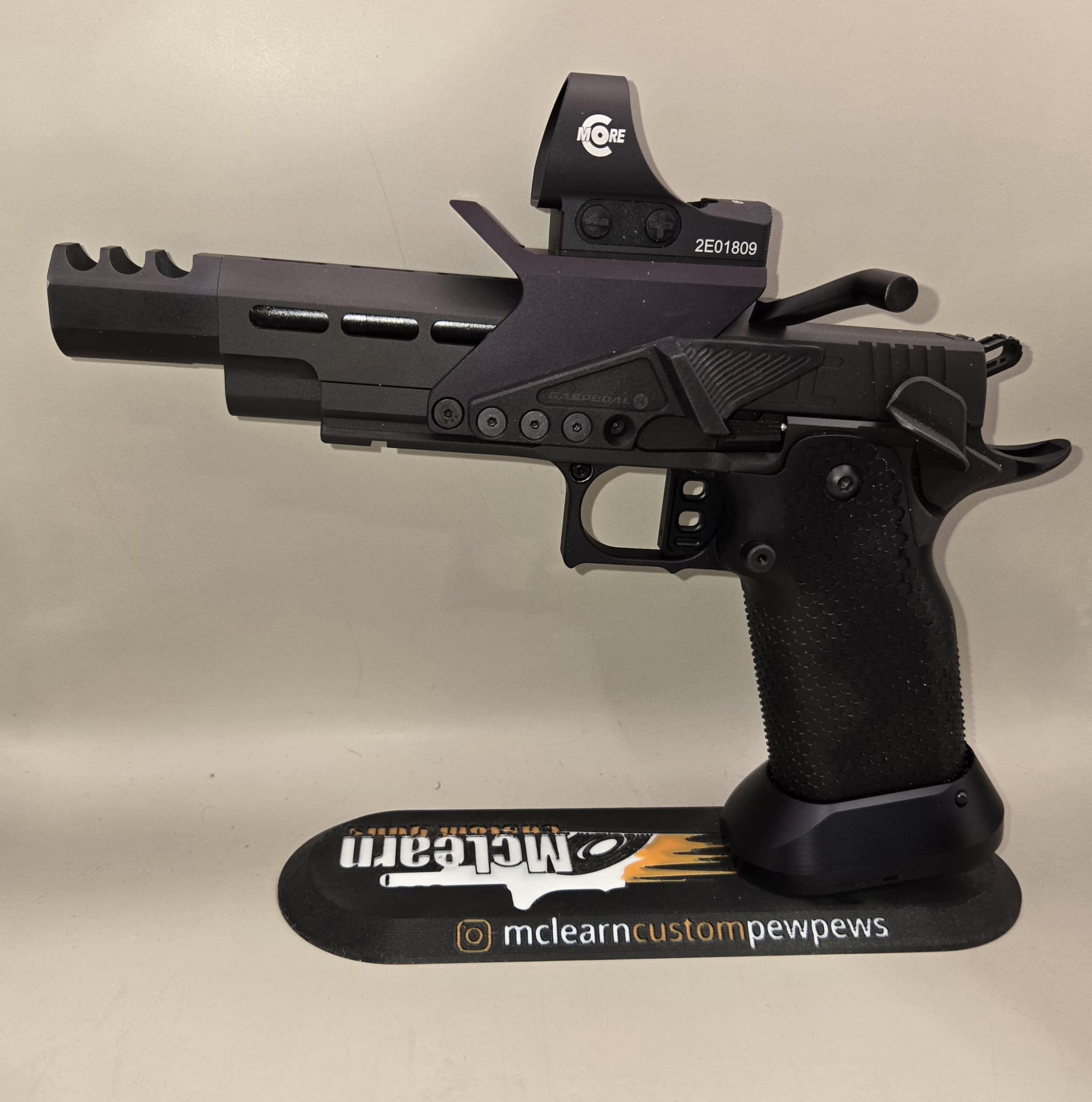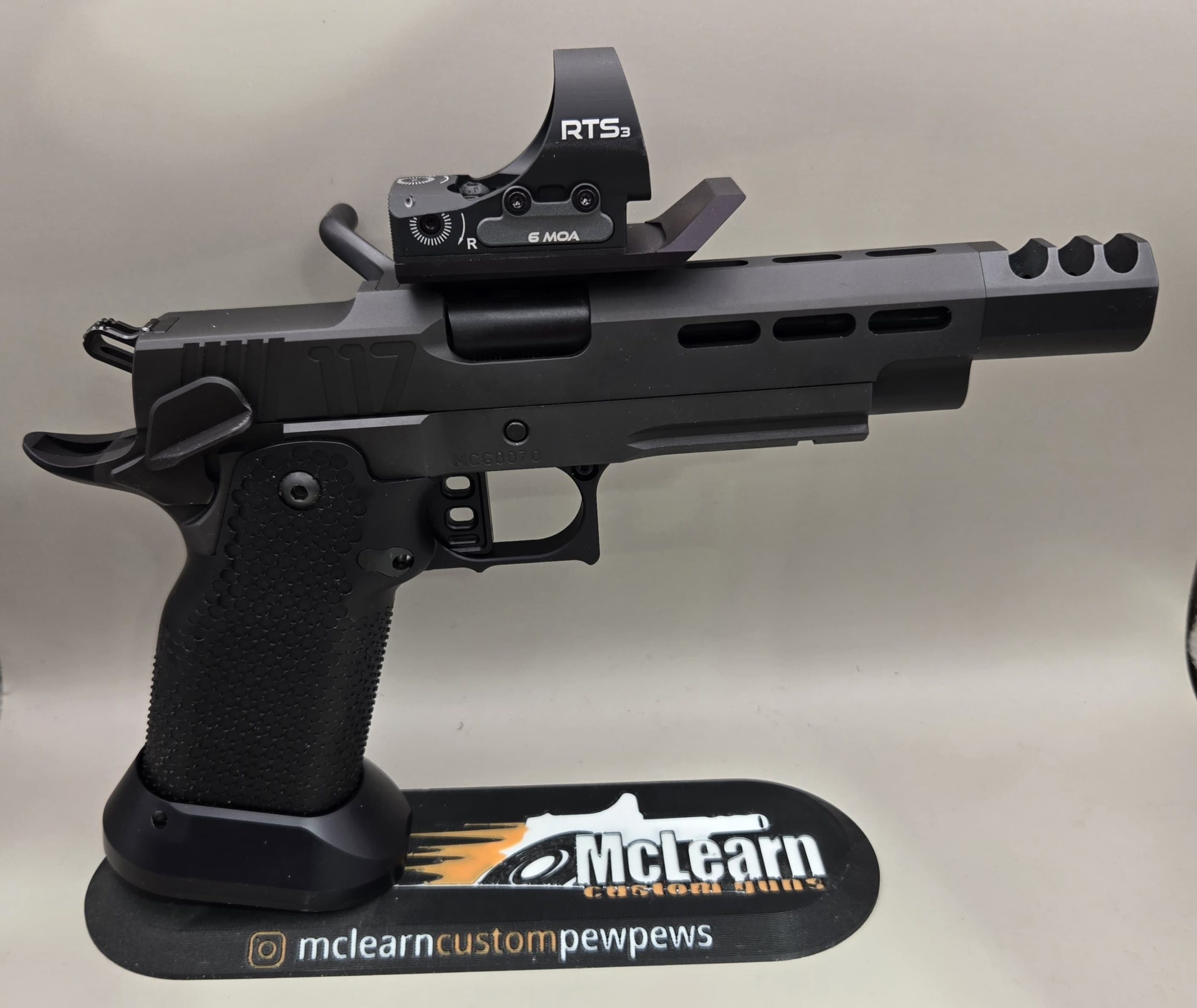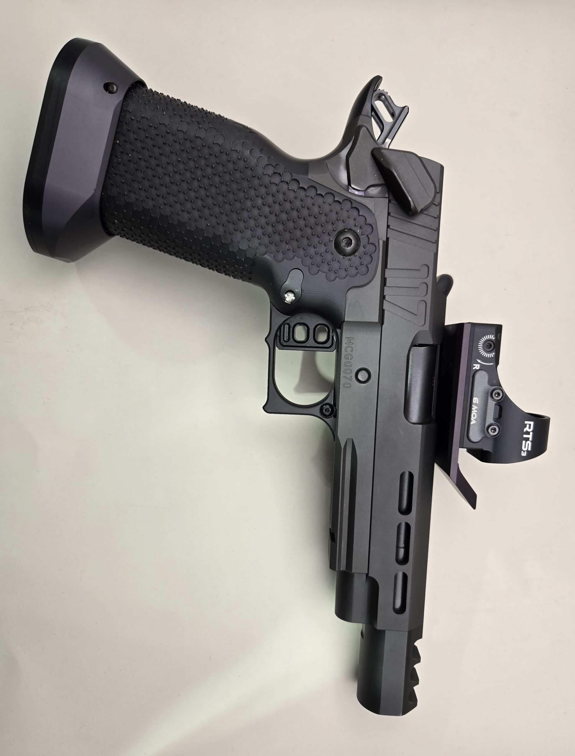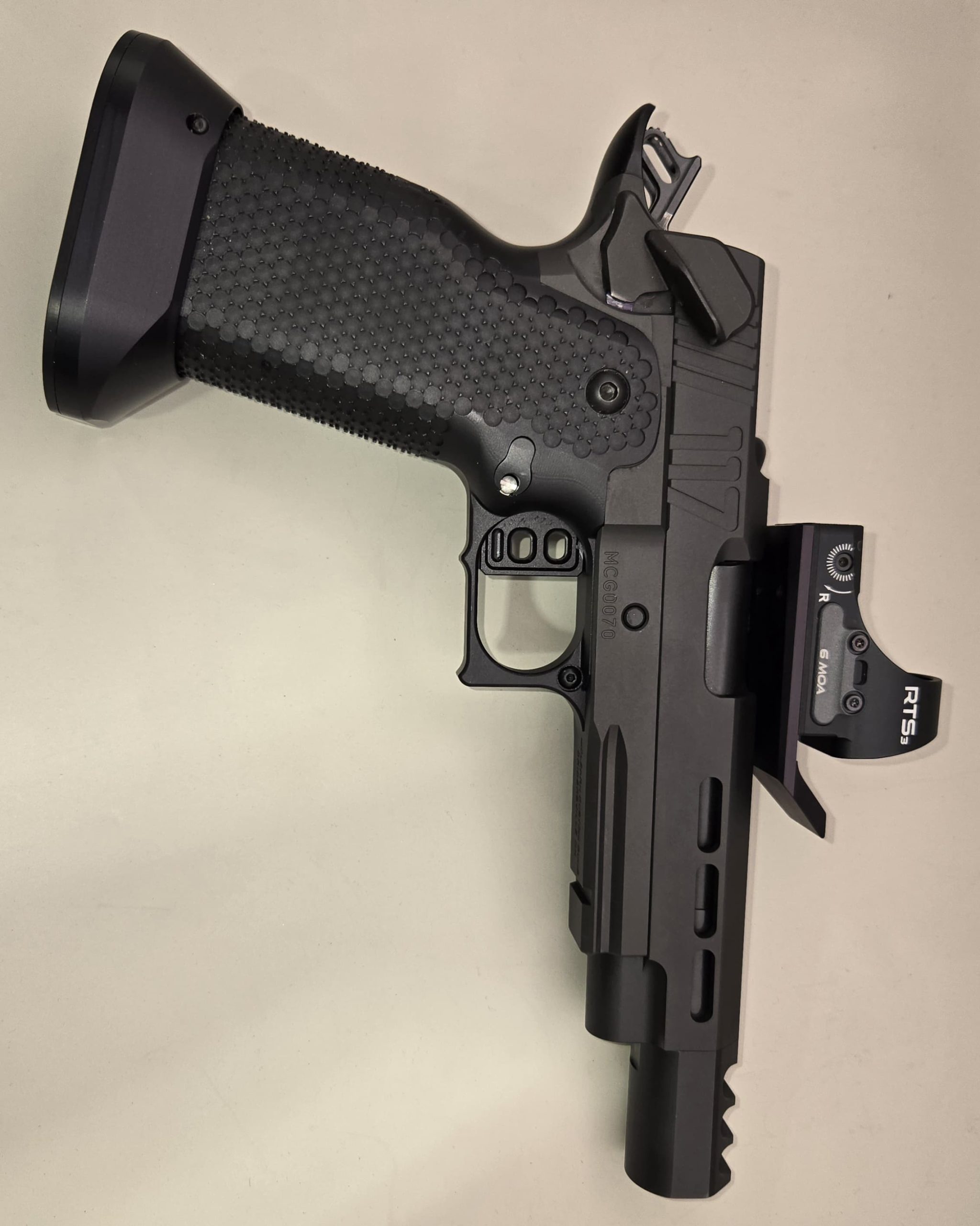 It has the Cheely aluminum E2 grip, along with the MCG frame, KKM barrel, and an additional threaded KKM barrel to use with a suppressor. EGW ignition parts and small internal parts. It is finished with a PVD and Nitride coating. Comes with a CMORE RTS2, 3 mags and a Pelican hard case.