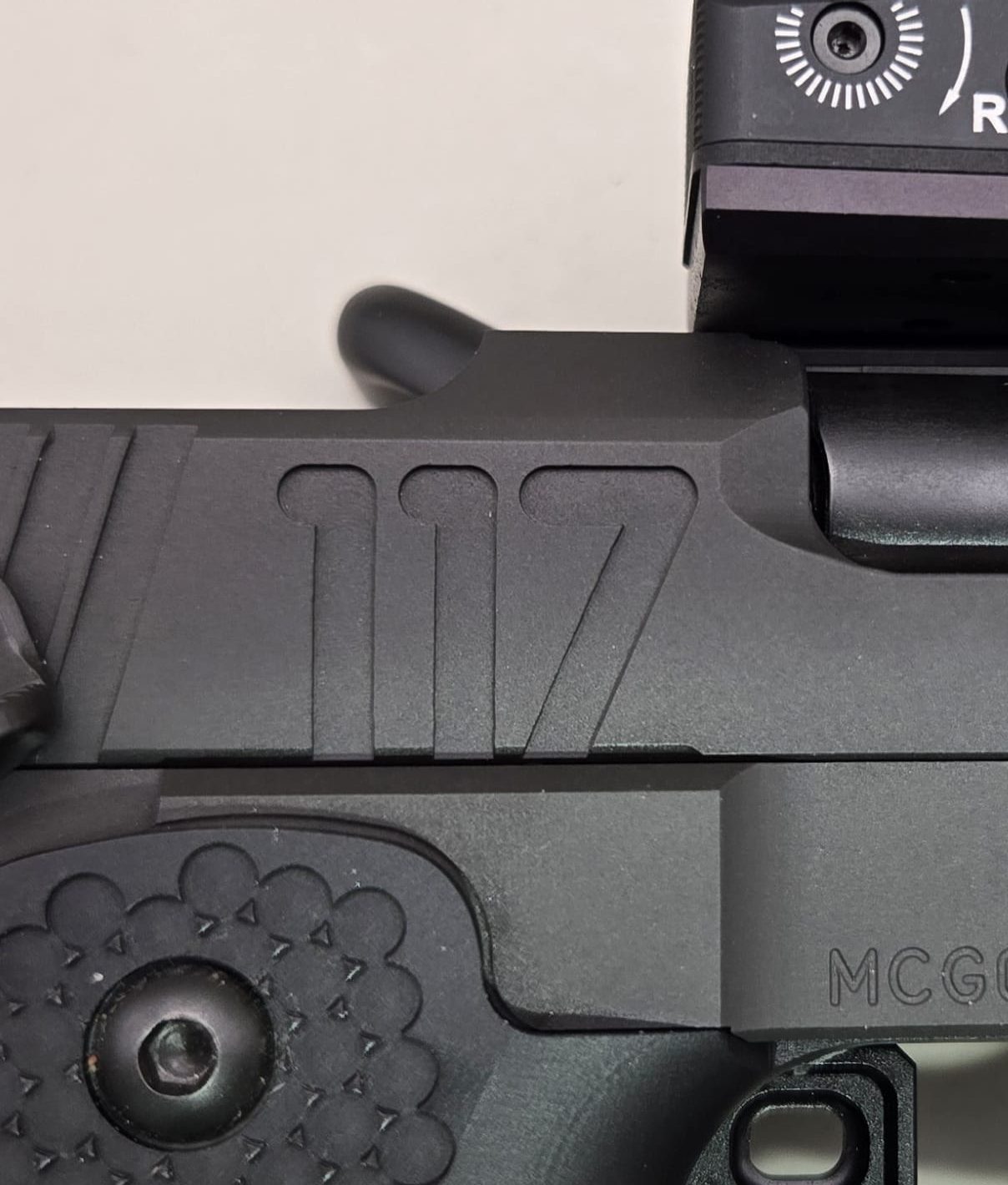 This pistol was meticulously hand built by Matt McLearn with the Halo theme “UNSC” and “117” engraved on the slide.